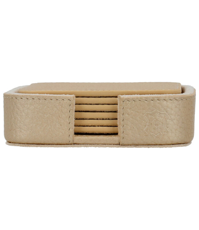 Set van 6 vierkante leren onderzetters in de kleur champagne, uit de ANNA-XS lijn van Chamada. Effen, strak en stijlvol. Geleverd in een bijpassend leren boxje. Subtiel detail op tafel, met een luxe uitstraling.