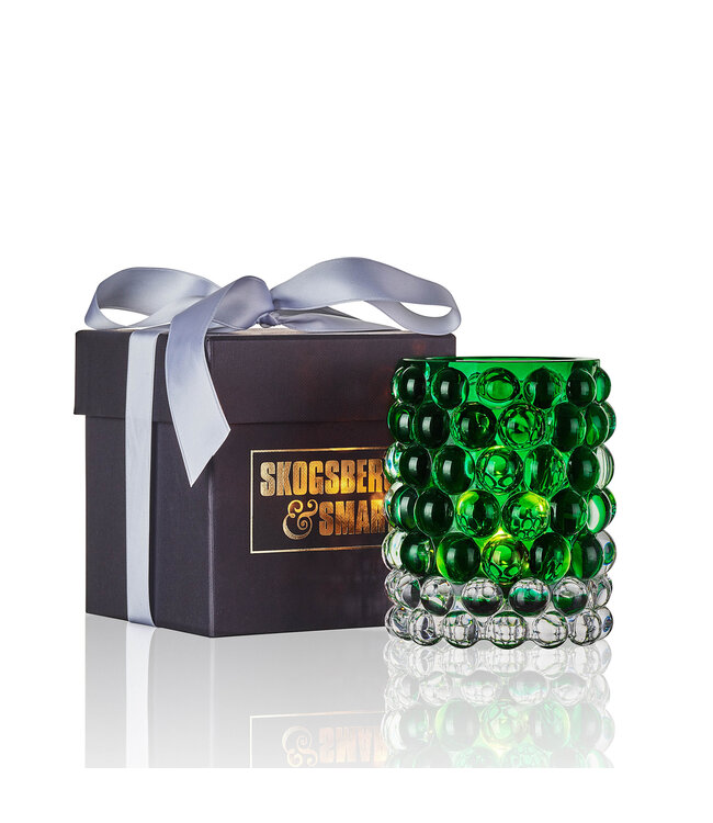 De Boule Regular Green van Skogsberg & Smart is een mondgeblazen windlicht met een opvallend patroon van bolvormige details. Elk exemplaar wordt met de hand gemaakt in Bohemen, waar de beste glasblazers ter wereld werken. De luchtbellen ontstaan in een gietijzeren mal en zorgen voor een unieke structuur en een luxe, zware uitstraling.
