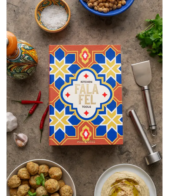 Met deze complete set maak je eenvoudig zelf falafel. De tools zitten in een stevige doos in de vorm van een boek. Handig om op te bergen en leuk om neer te zetten tussen je kookboeken in de keuken.